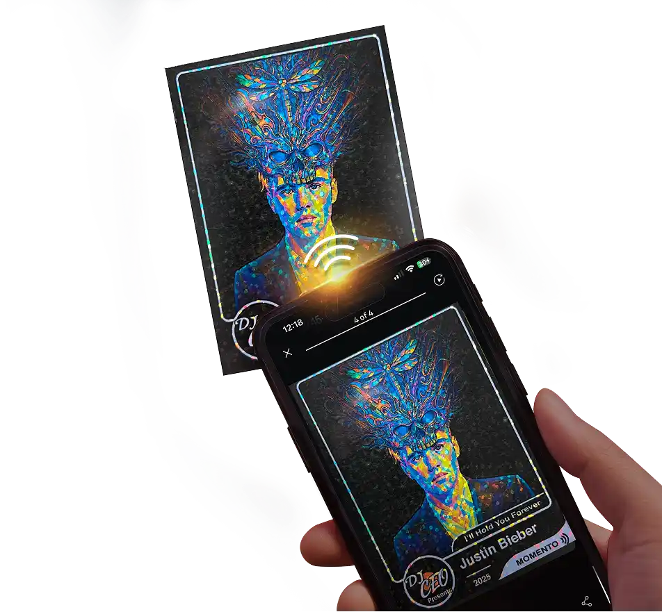Each Momento NFC chip in the card contains an invisible, factory serial number that can’t be cloned or altered. When you hold your phone close, the chip sends out a secure radio signal that instantly connects with your device unlocking exclusive videos, photos, and music in seconds.